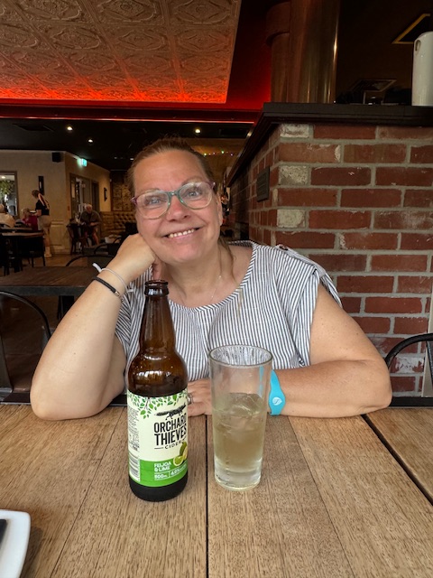 Vi havde ikke overvejet at der ville være mad til 2 mennesker på sådanne en tallerken, for så havde vi kun bestilt den. Regina bestilt en cider og forventede at få et lille glas, men fik en flaske på 500 ml og 4,5%.