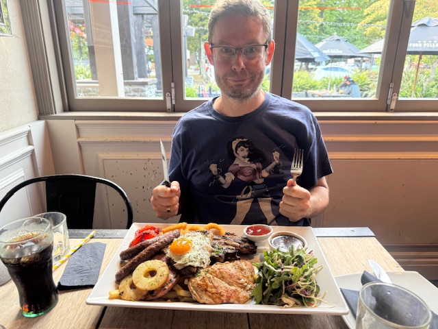 Det var så meget i overskud, som vi fik med. Så er aftensmaden klaret i morgen også. Der skal bare koges noget pasta, som vi har et skvat tilbage af. Kim gik tilbage til bilen med resterne, for at få sat det på køl, og så fik Regina klaret regningen.