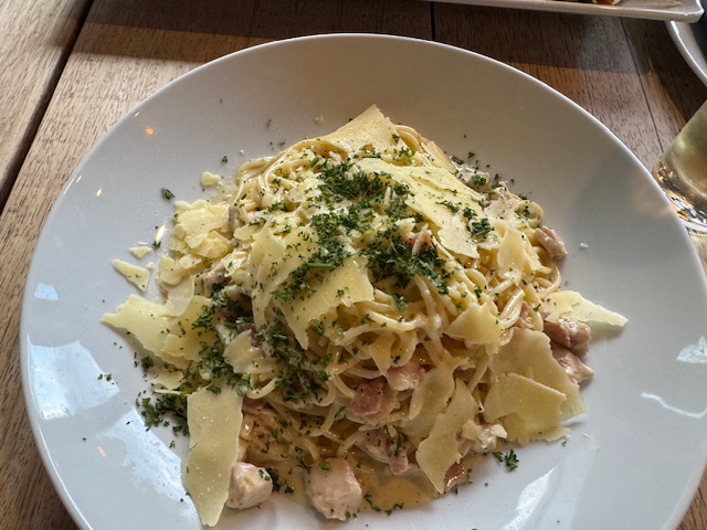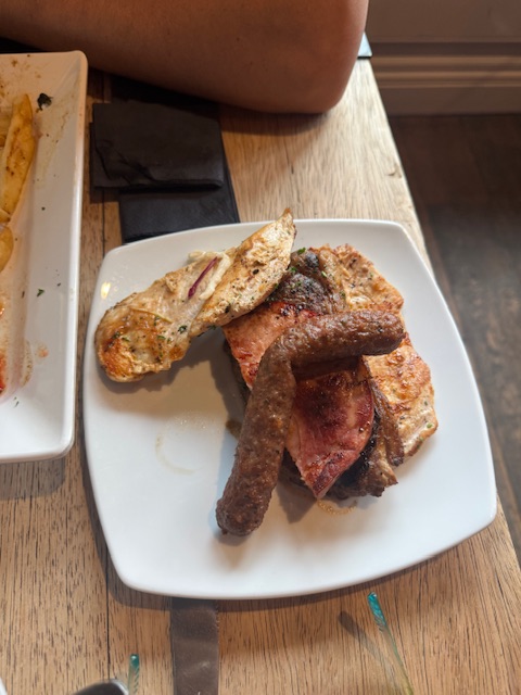 Vi prøvede at booke noget campning med kunne ikke få deres hjemmeside til at virke. Den kunne ikke lide vores mobil nummer. Så efter vi var godt gennemvarme på en super skøn solskins dag, som bød på korte bukser og kjole, styrede vi bilen dertil og fik booket en nat. Vi havde ladet vores badetøj og håndklæder blive ved poolsne, for vi havde lejet et skab. De havde nogle små centrifuger i omklædningsrummet, så man kunne give sit badetøj en snore tur, så var det næsten tørt. Vi lod bilen stå og gik tilbage til byen, 10-15 min. Så lidt på, hvad den havde at byde på. Det var ikke fordi det var meget, igen lukkede de kl 17 så var det kun Bar’er og restauranter der havde åbent. Vi fandt et sted der havde lidt blandet på kortet. Vi bestilte noget pasta med kylling og en landmands tallerken. Der skulle være forskellige stykker Kød og kartofler.