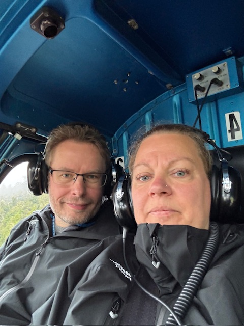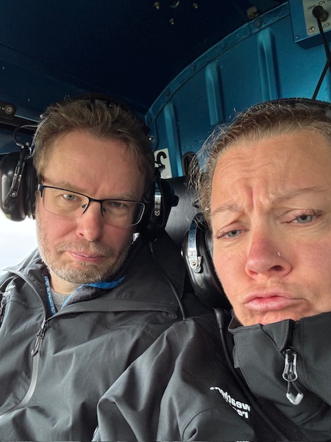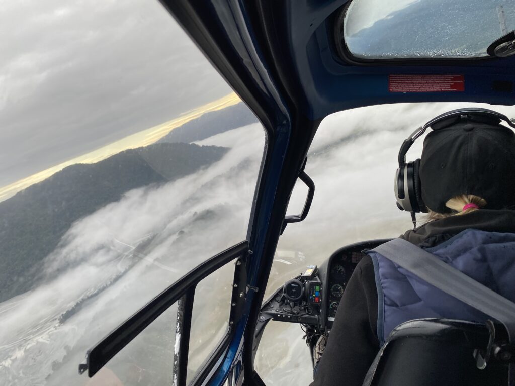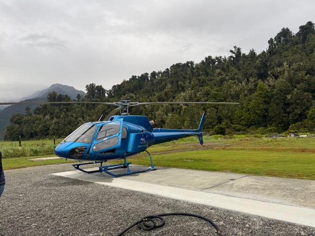 Vi var oppe tidligt for vi havde en flyvning kl 9 og skulle være der en halv time før fors at tjekkes ind og blive vejet. Det var en overflyvning over 2 gletsjere med landing på den en af dem. På vejen der ud kunne vi fint se op på skyerne, så jahhhh vi glæde os. Efter at være blevet informeret om hvor flyvningen ville gå til, lidt afhængig af vejret og en sikkerhedsgennem gang, blev vi  stoppet i en bli sammen med nogle andre og kørt ud til hvor de havde deres helikoptere. Vi blev delt i 2 hold, så os med de røde bånd blev sat i en og dem med det blå skulle med en anden.