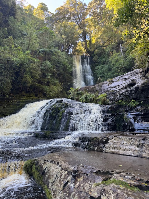 Kim havde så fundet en anden tig som vi skulle se. Et vandfald. McLean Falls. Der var der også en 40 min retur tur. Men den var helt vild flot og sjov. Det var som at gå på opdagelse i regnskoven. Mange steder var der vådt, fordi der var så meget fart på vandet der fossede ved siden af hvor man gik. Nogle steder løb der også vand ned af stien hvor man gik og gjorde det vildt glat. Da man kom frem til vandfaldet var det helt vildt flot. Det skulle være et af de mest fotogene vandfald i New Zealand.