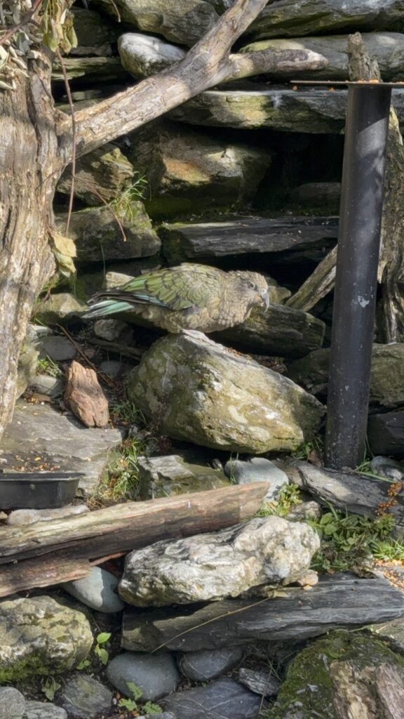 Vi fik kun set 2 ud af de 3 (hannen som var mindre gemte sig godt). I resten af parken havde de andre specielle New Zealandske dyr, mest fugle som Kea, Kākā, Kākāriki, men også en Tuatara, som ligner et firben (men ikke var en øgle). De har levet i New Zealand siden dinosauerne og findes kun her. Vi kunne ikke finde den store (de kan blive op til 80 cm) men der var en lille en i sit eget terrarie, som vi efter noget besvær fik øje på.