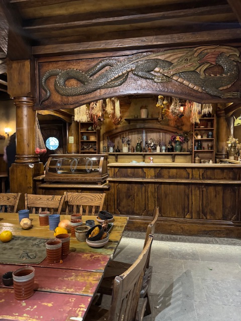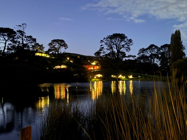 Da mørket begyndte at falde på, gik vi gennem det sidste af Hobbiton, for at gå over broen til deres pub, the Green Dragon, hvor vi skulle spise. Vi startede dog med at få noget at drikke mens maden blev gjort klart. Imens kunne man gå rundt ved søen og se over på højen med alle husene.