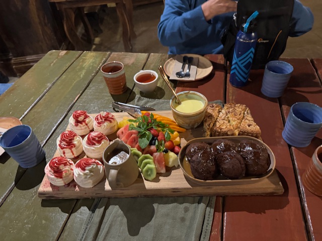 Vi fik ikke smagt det hele, for der var så meget. Da folk var færdige, blev vi sendt udenfor, med en kop kaffe eller te, for at få lidt luft og se alle husene med lys på. De fik taget af bordet, og gjort klart til dessert. Det var ikke lige frem fordi vi var sultende. Med der kom virkelig meget ind: pavlova, dog uden frugt i, der var masser af frugt ved siden af, sticky toffy pudring, tærte med nødder og vanilje sovs og ikke at forglemme den varme æblekage. Så man kunne trille derfra. Men alt sammen var meget velsmagende. Det er godt man kan dele.