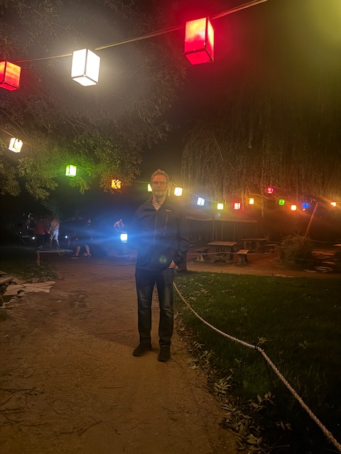 Da det var tid til at afslutte aftenen, fik vi lanterner i hånden og gik gennem noget af Hobbiton, for at se det med lys på og få flere historier.