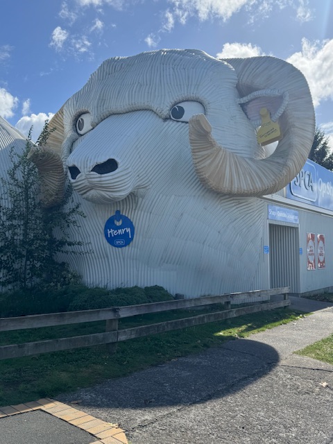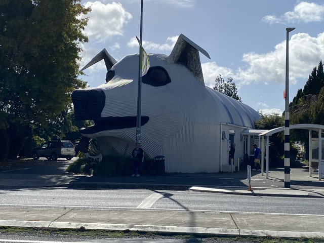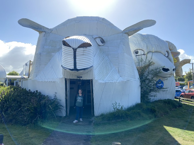 Det specielle ved denne by var 3 bygninger, der lignede to store får og en hyrdehund. Hunden var et offentligt toilet og infocenter. Den ene af fårene var en lille souvenerbutik og den sidste var vi ikke inde i så den ved vi ikke hvad var. Det virkede som en rigtig god ide, for der var mange der stoppede i en by der ellers ikke var meget andet end en gennemkørselsby.