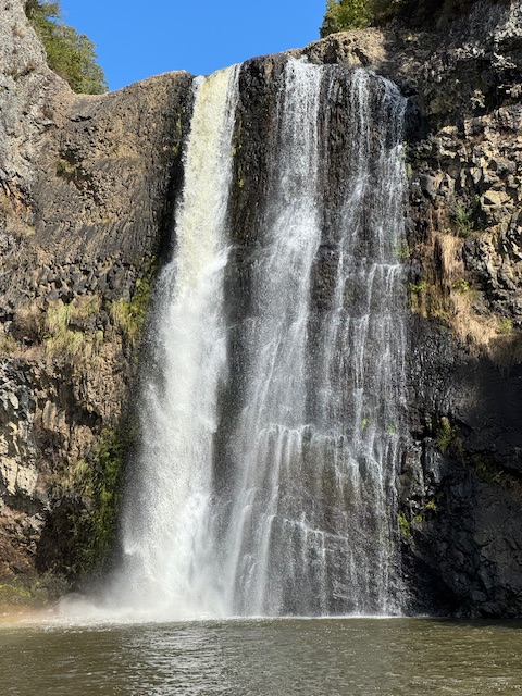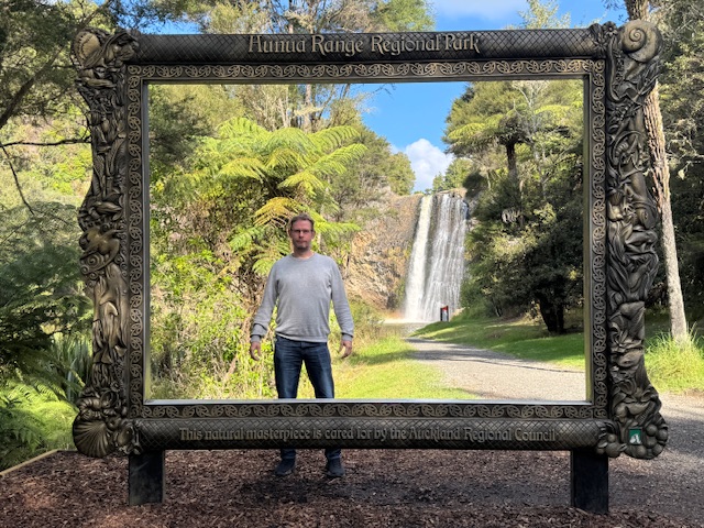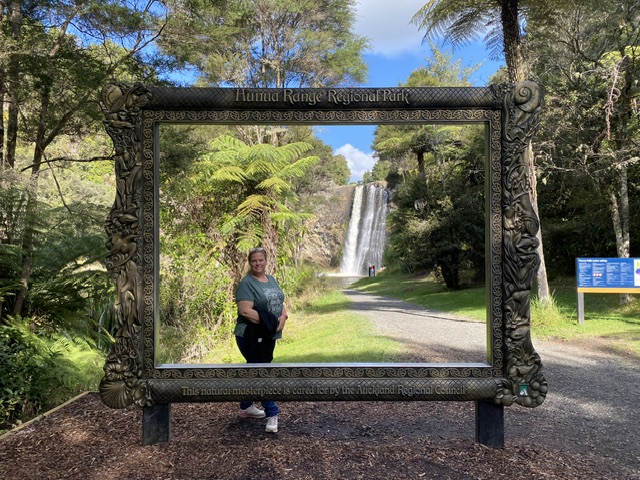 Næste stop var et vandfald der hed Hunua Falls. Der stod at man skulle gå 20 minutter for at komme til vandfaldet, men efter lige at have været på toilettet ved parkeringspladsen gik Regina lige op for at se på nogle skilte og stod næsten lige foran vandfaldet. Det viste sig at det kun var hvis man skulle op til toppen at det tog tid, så Kim fandt dronen frem og fik leget lidt. Første flyvning glemte han dog at starte optagelsen, så han måtte prøve igen. Der kom dog et par fine små videor ud af det, men han er stadig kun ved at lære at bruge den.
