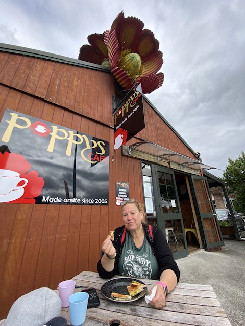 Der var ikke morgenmad med på hotellet, så vi havde besluttet at køre ca. en lille time nordpå for at få morgenmad i en lille by, som Regina havde sat mærke ved og som vi havde passeret hurtigt da vi var ved Hobbitton.