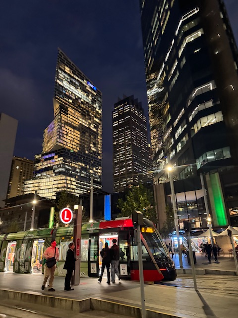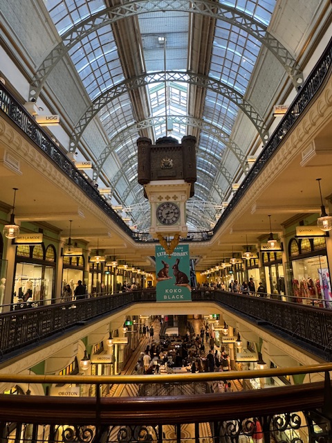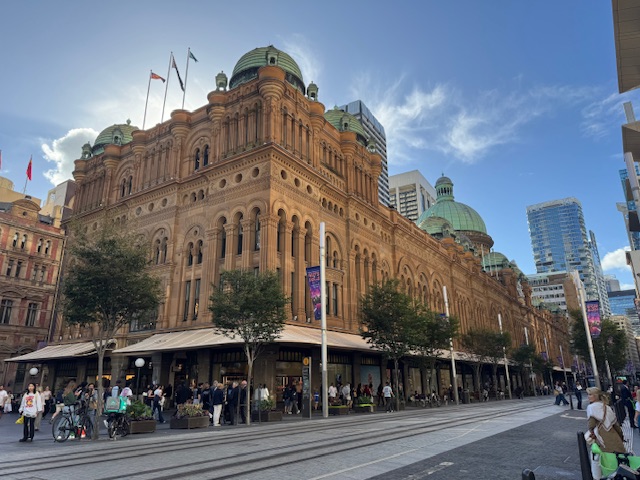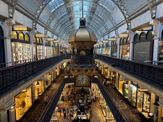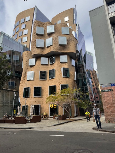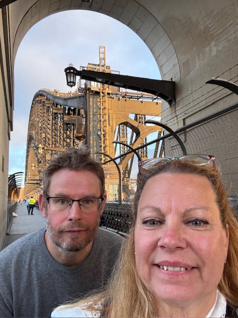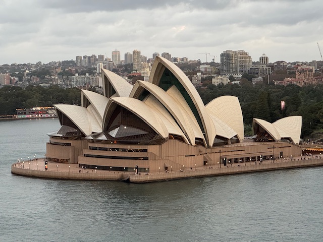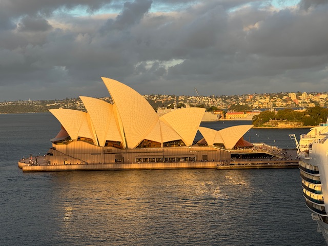 Vi satte næsen mod havnen og et område vi ikke havde gået i. Var inde i en arkade i et pat etager, hvor der var tæppe på gulvene. Den var meget fin vi var inde i et galleri og så på litografier med Dr Seuss’ figurer. De startede på omkring 2000 $ aus. Så der blev pungen i lommen. Vi ville op og gå på broen for at få et godt udsyn over operaen. Vi troede vi var smarte og ville op tidligt så klatrede op af nogle stejle trapper, for at finde ud af at vi skulle ned igen 300 m længer fremme. Men kunne gå op med det samme igen, bare lige om hjørnet. Der var kommet et af de der monstre af et krydstogtskib ind i havnen og dækkede for vores udsyn. Det var lige før, det var kommet med i et spil sænke slagskibet. Men vi fik et fint udsyn af operaen ved solnedgang, når vi kom længere frem på broen. Så det var virkelig fint.