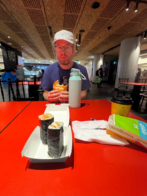 Opgave 1: find et food court og få noget morgenmad. Kim fandt noget naanbrød med ost og løg. Regina 2 stænger sushi, en med laks og anden med kylling og så lidt kaffe.